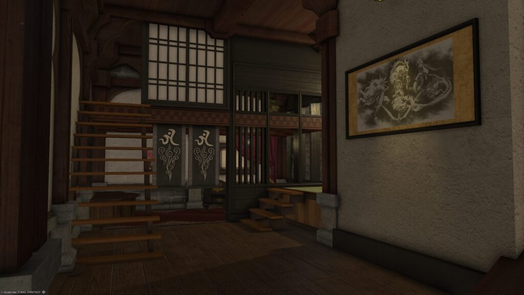 ロフトに小上がりの合わせ技。廊下に佇む四聖獣図が空間を引き締める。
