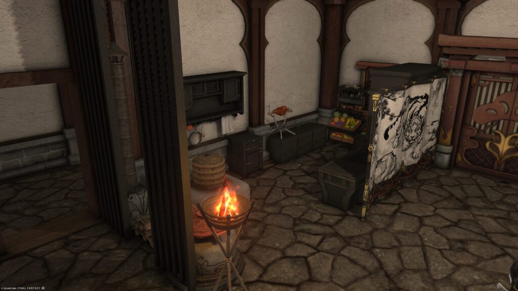 白虎の屏風は入室直後の迫力と台所の目隠しを兼ねる。